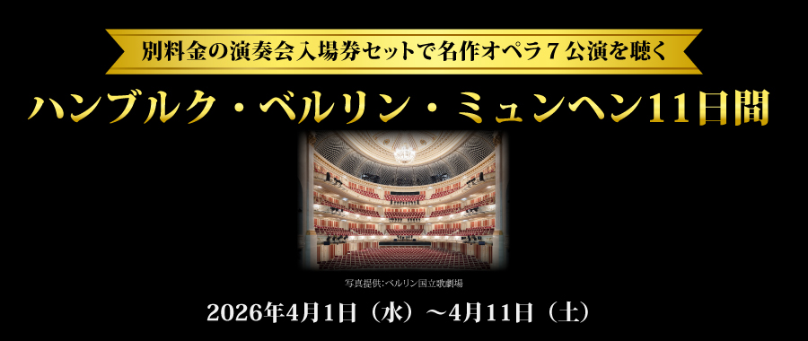 | ツアー概要 | 春が訪れた喜びと復活祭の祝祭気分に満ちたドイツ3つの大都市を訪れます。 4連休となるこの時期にあわせて各劇場が用意した人気演目が目白押しの7公演を連日お聴きいただきます。 都市間の移動は高速列車、全都市で5つ星ホテルをご用意しました。 |