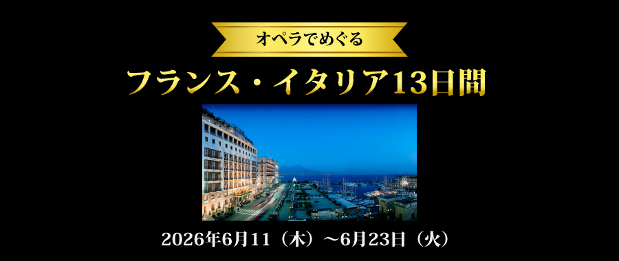 | ツアー概要 | フランスとイタリアそれぞれに5泊して、主にイタリア・オペラをお聴きいただきます。すべての都市で劇場へ徒歩圏にあるホテルをご用意し、ゆっくり訪れる機会が少ないリヨンとナポリでは2日間滞在して市内と近郊の名所もご案内します。 美食の街リヨンでのミシュラン2つ星レストランでの昼食、ナポリの最高級ホテルの海側の部屋での2泊の滞在など魅力満載の旅行です。 |